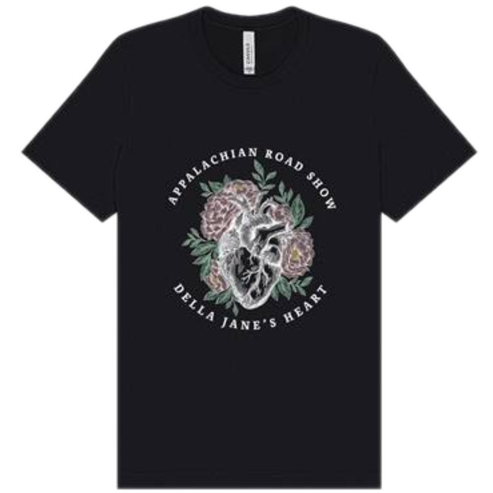 Unisex black tee with Della Jane's Heart design on the front and logo on the back with logo.