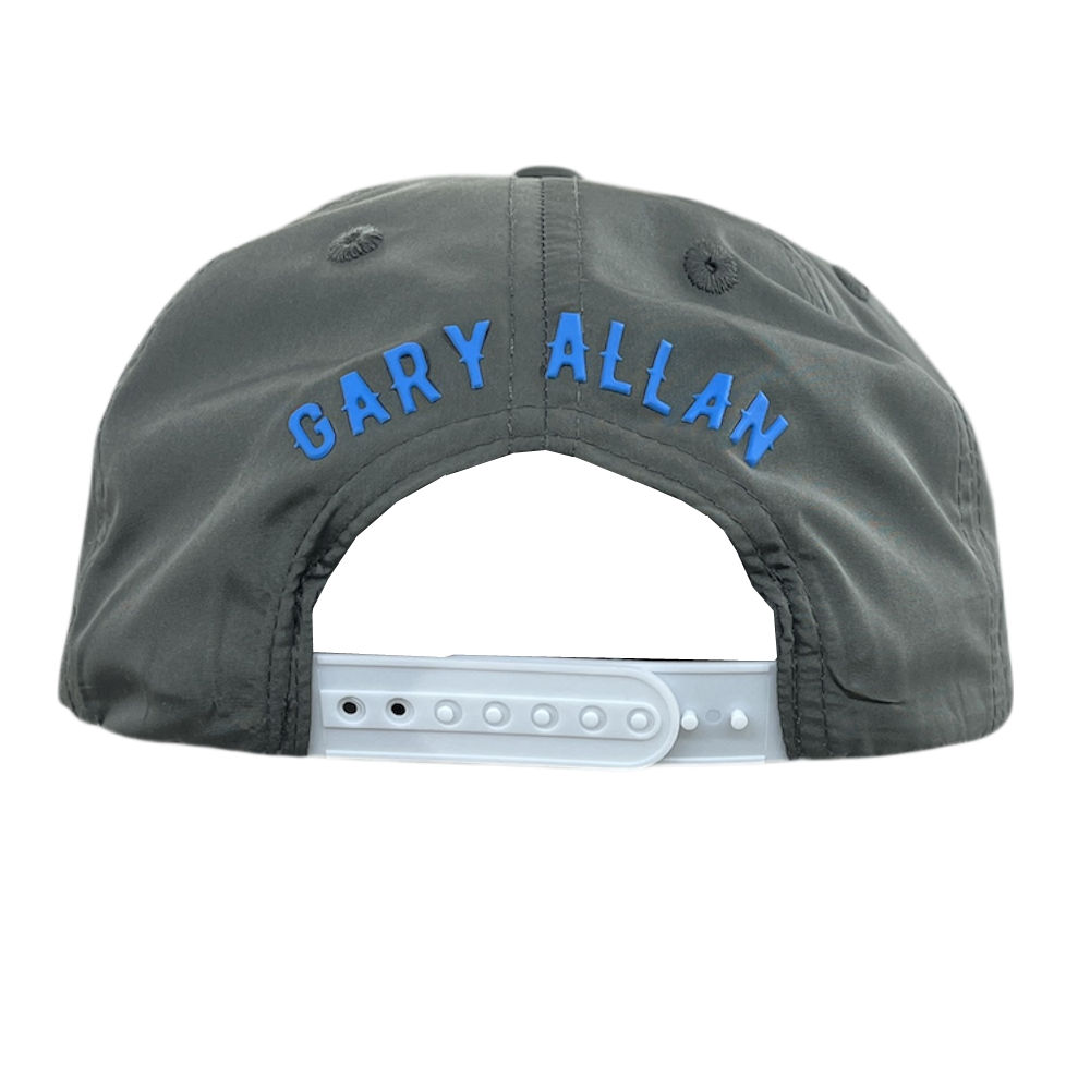 Gary Allan constructed soft cloth back gray flat bill hat with Every Storm Runs Out of Rain in a rubber stamp. Gary Allan on the back in rubber stamp. Adjustable plastic backstrap.