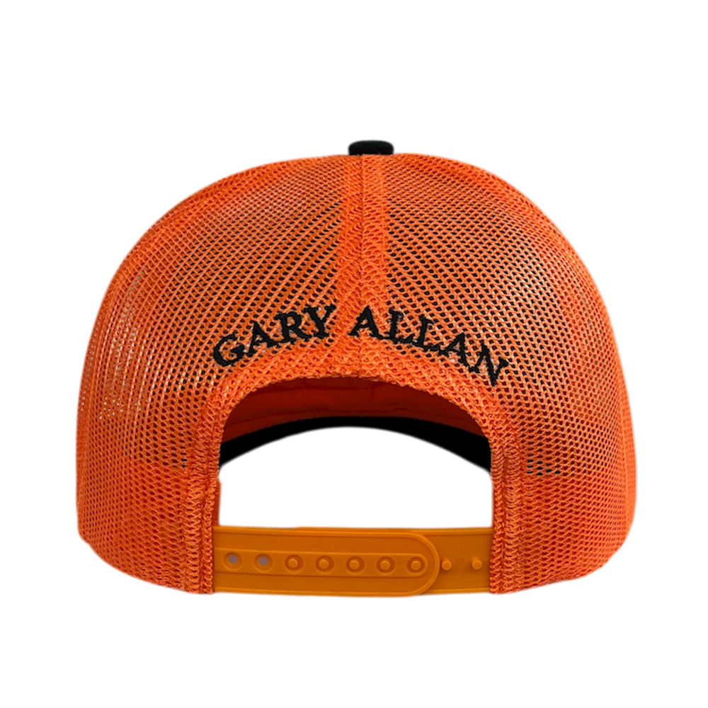 Gary Allan low profile, constructed black hat with neon orange mesh backing. Adjustable plastic backstrap.