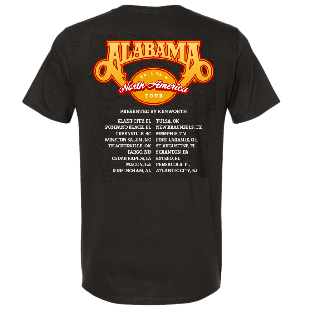 Unisex black ink heather tee with Roll On Tour 2 truck design on the front and North American Tour presented by Kenworth and tour dates on the back.